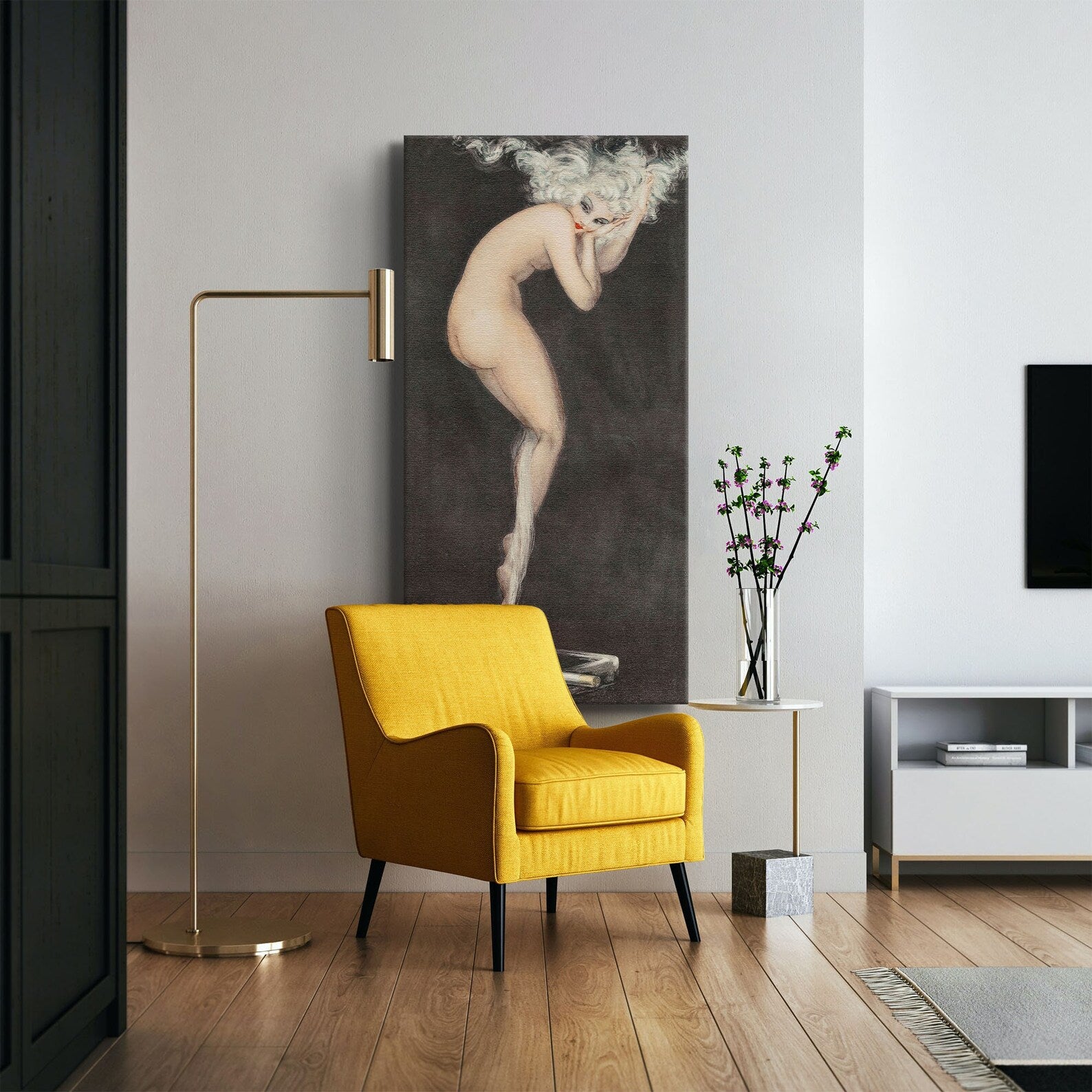 Se ci mandi la foto della tua parete possiamo realizzarti un render con il quadro che desideri.